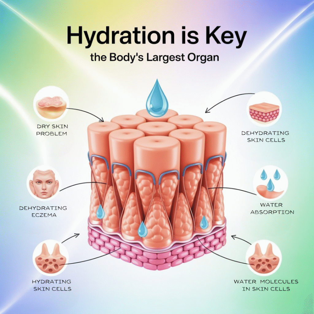 Your skin is your body’s largest organ, and like all organs, it depends heavily on proper hydration. The deeper layers of your skin need water to maintain the structure and function of skin cells, while the outer layer relies on adequate moisture to maintain its protective barrier function.